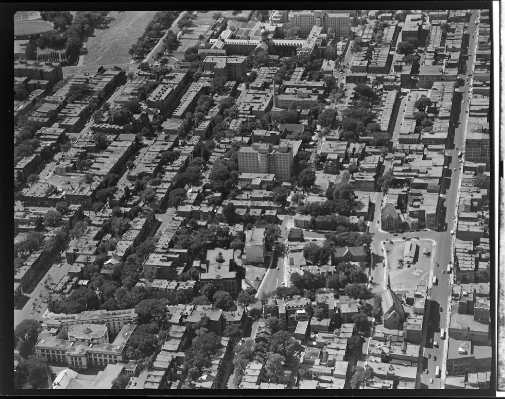 Vue aérienne du quadrilatère formé par les rues Sherbrooke, du Parc, des Pins et Saint-Laurent à Montréal