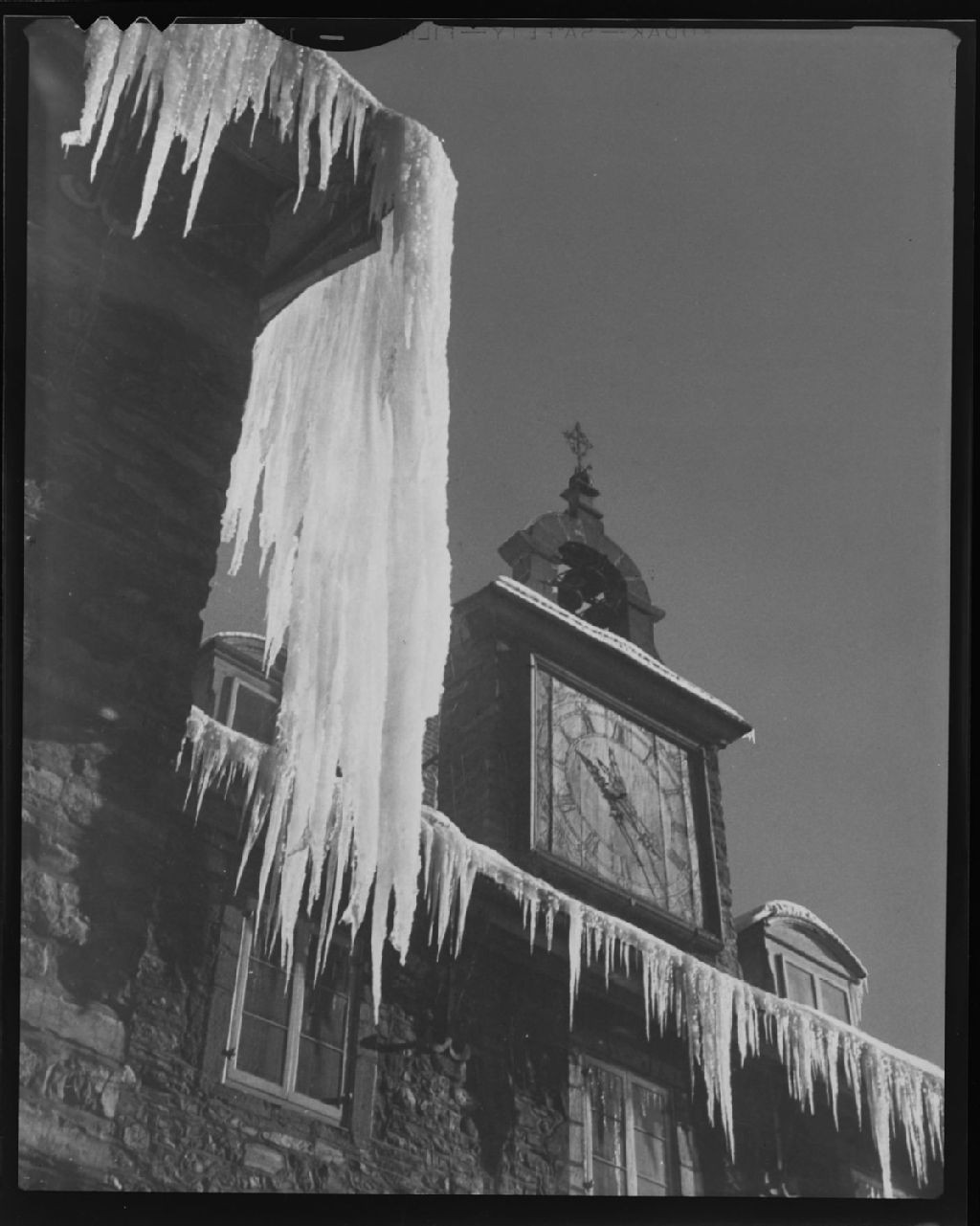 Vues de la glaçe présente sur le toit du Vieux séminaire de Montréal (130 rue Notre-Dame Ouest), [Vers 1965], Archives nationales à Montréal, Fonds Armour Landry, (06M,P97,S1,D14274-14275), Armour Landry.