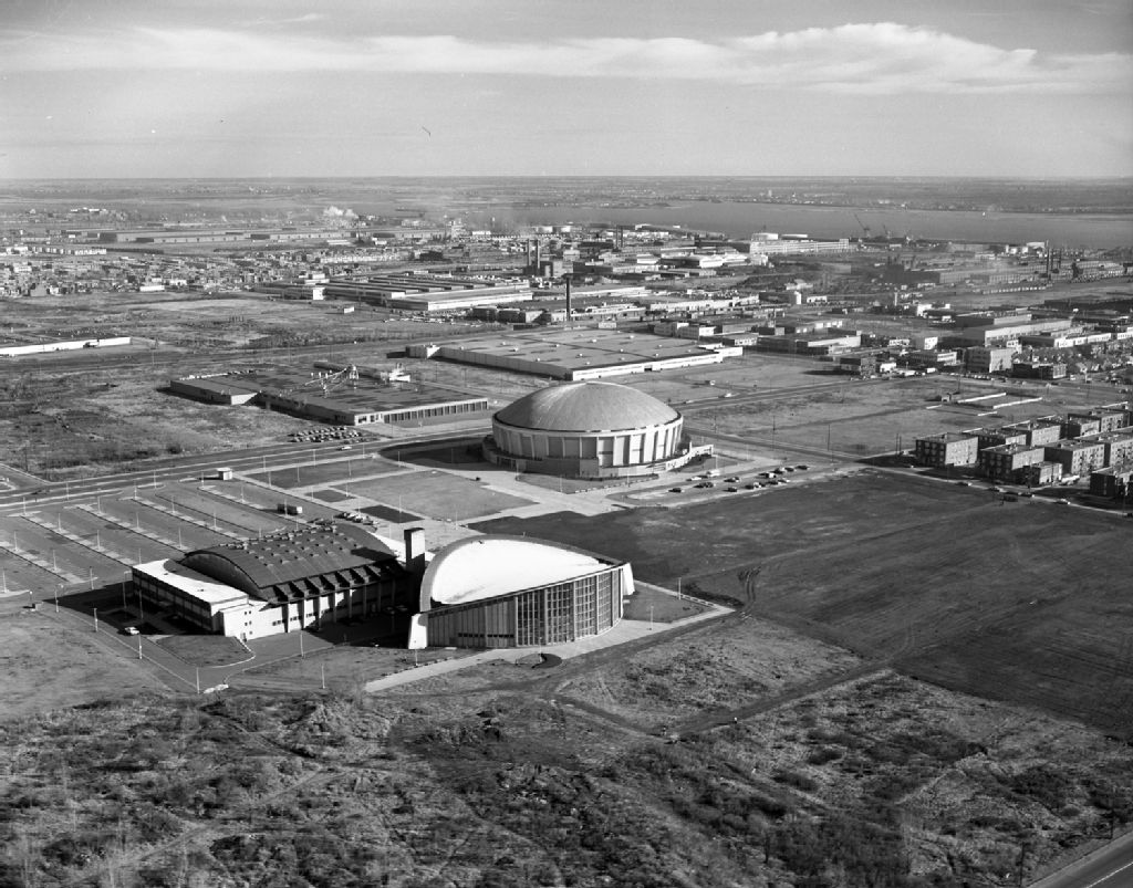 Vue aérienne de l'aréna Maurice Richard et des alentours, Montréal
