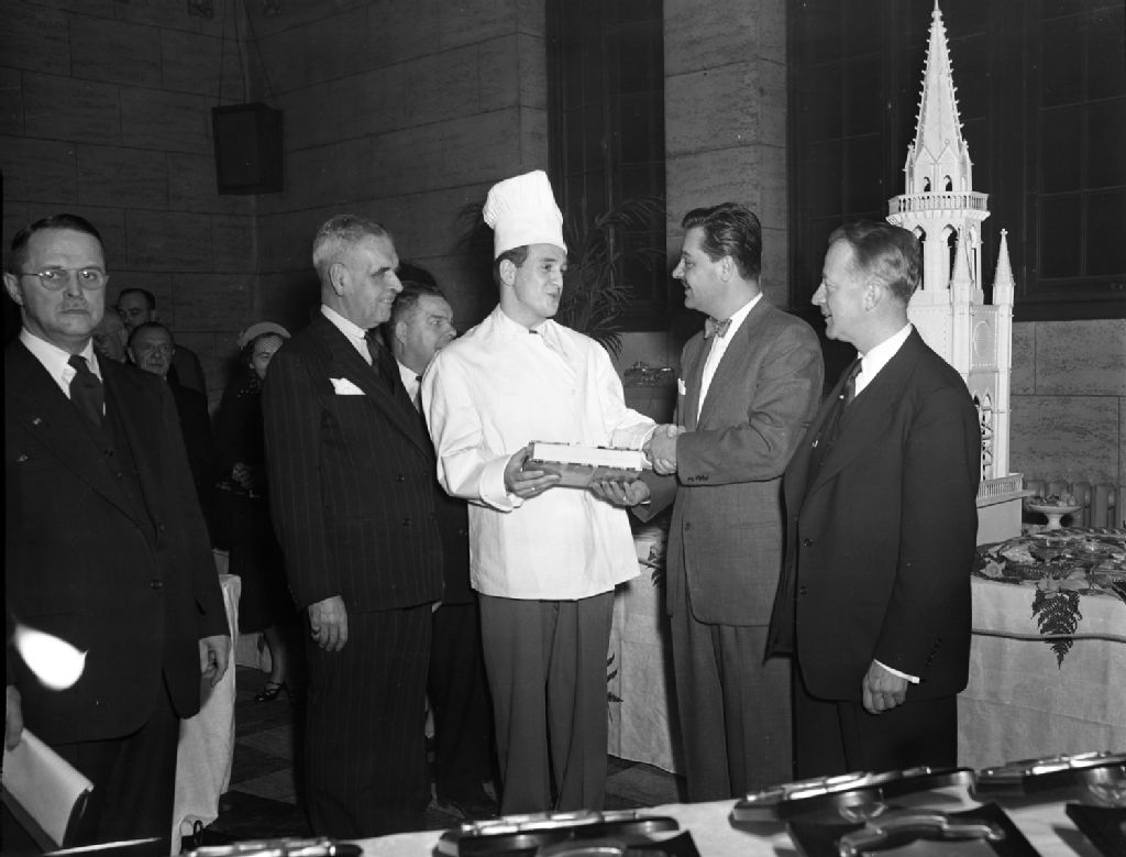 Une remise de trophée au Salon de l'art culinaire, organisé par le ministère du Commerce et de l'Industrie du Québec, à Montréal (probablement au Palais du commerce)