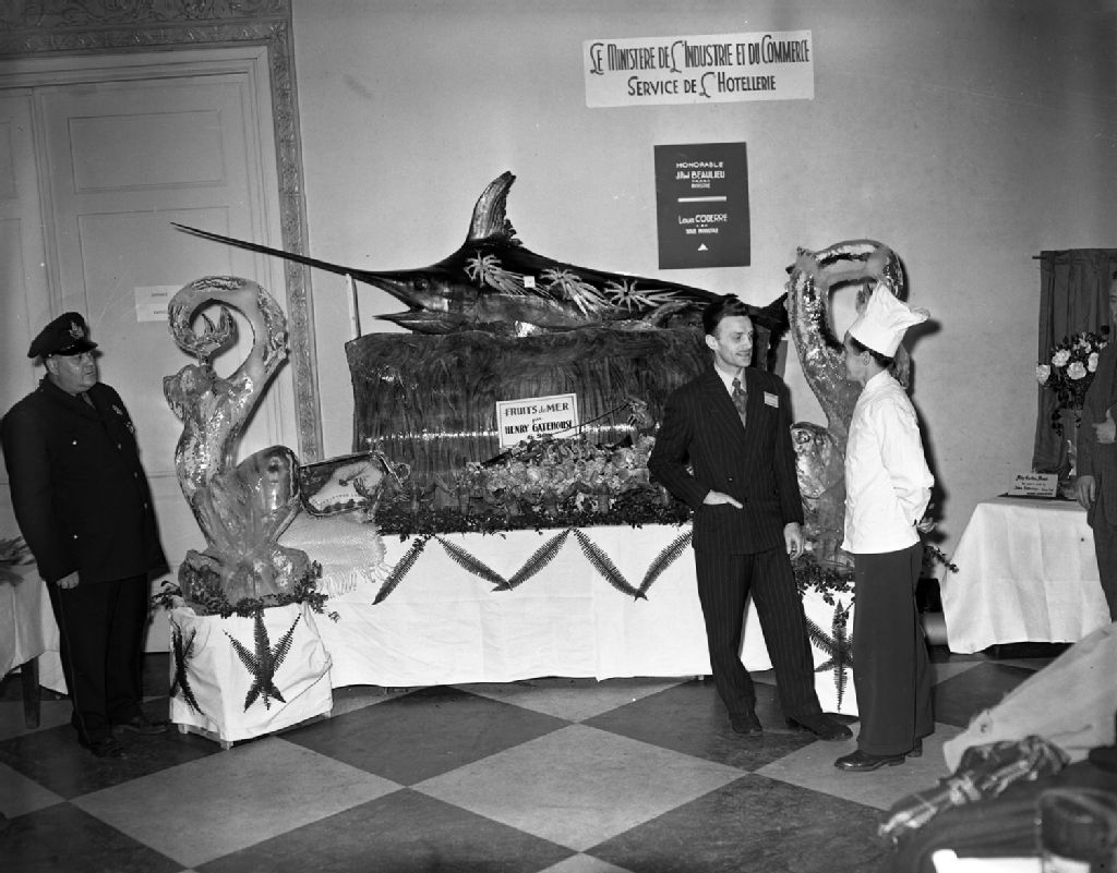 L'oeuvre de M.Henri Gatehouse "Fruits de mer" au Salon de l'art culinaire, organisé par le ministère du Commerce et de l'Industrie du Québec, à Montréal (probablement au Palais du commerce), 1952, Archives nationales à Montréal, Fonds Armour Landry, (06M,P97,S1,D14471-14471), Armour Landry.