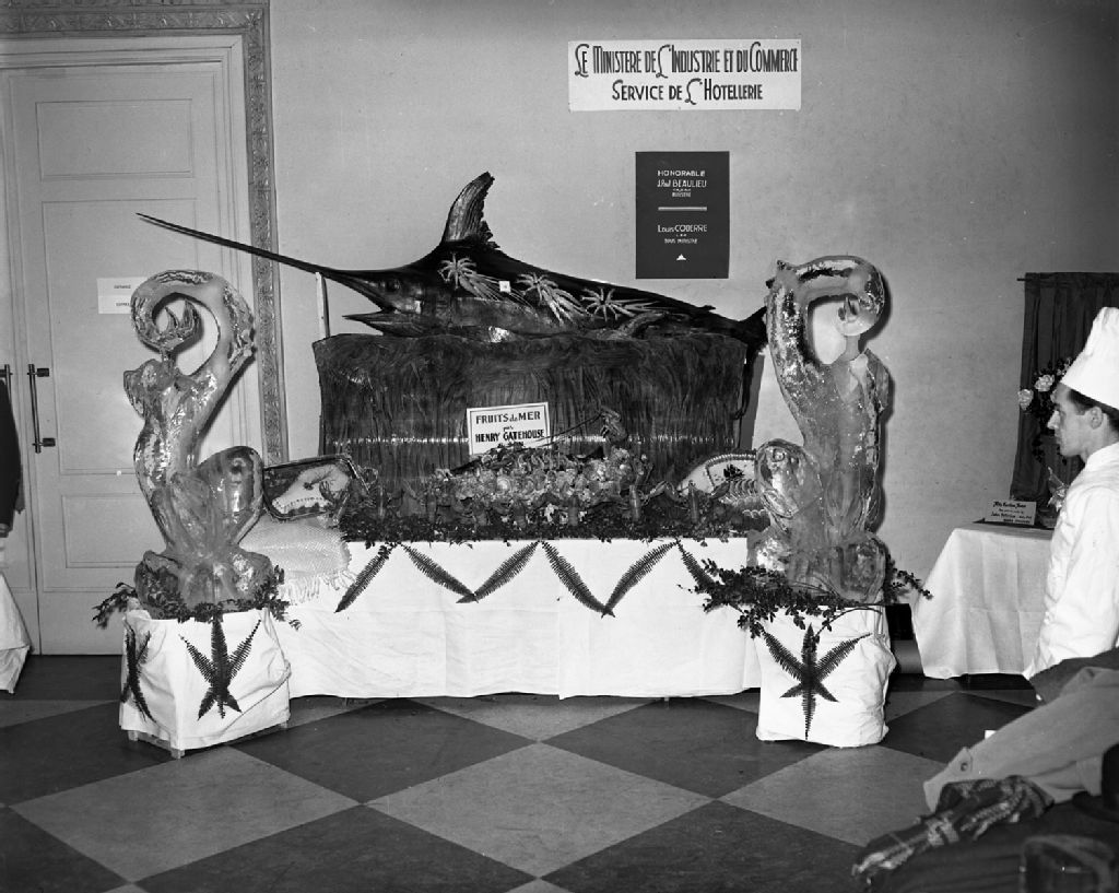 L'oeuvre de M.Henry Gatehouse, "Fruits de mer", au Salon de l'art culinaire, organisé par le ministère du Commerce et de l'Industrie du Québec, à Montréal (probablement au Palais du commerce), 1952, Archives nationales à Montréal, Fonds Armour Landry, (06M,P97,S1,D14472-14473), Armour Landry.