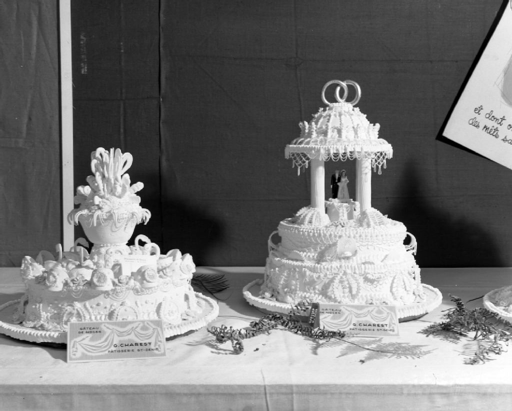 Des gâteaux de noces, oeuvres de M.G.Charest de la "Pâtisserie Saint-Denis", pour un concours culinaire à Montréal