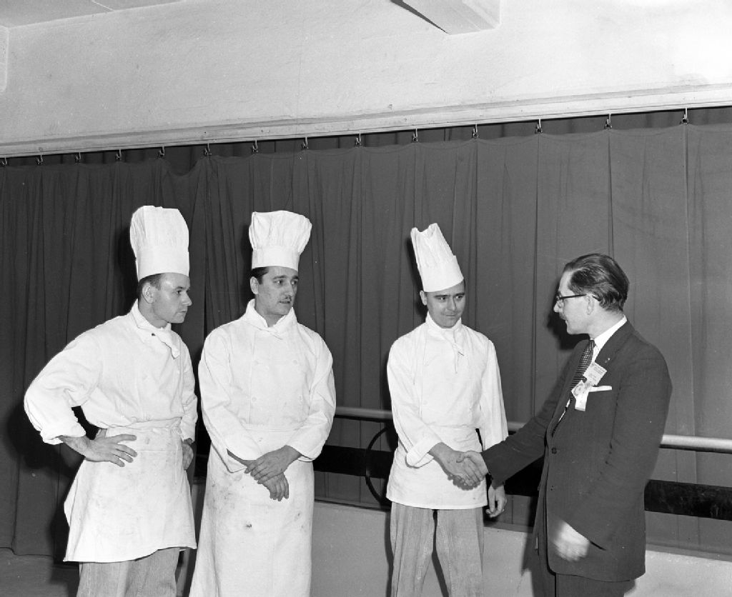 Les cuisiniers et un membre du comité d'un concours culinaire à Montréal, 1959, Archives nationales à Montréal, Fonds Armour Landry, (06M,P97,S1,D14501-14501), Armour Landry.