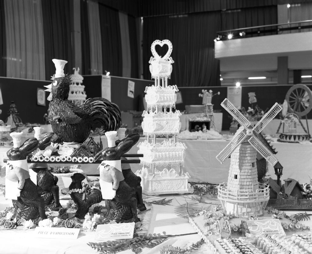 Oeuvres de la pâtisserie "Maxime Cousin Inc." au Salon de l'art culinaire, organisé par le ministère du Commerce et de l'Industrie du Québec, à Montréal (probablement au Palais du commerce), 1959, Archives nationales à Montréal, Fonds Armour Landry, (06M,P97,S1,D14509-14509), Armour Landry.