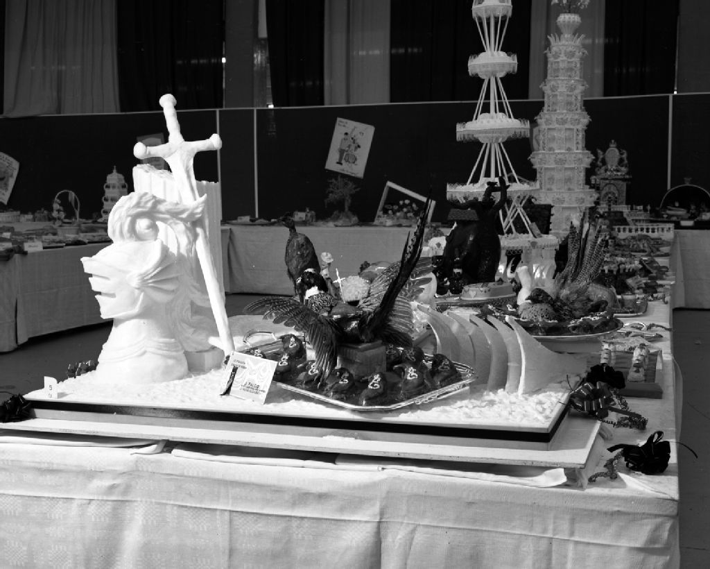 L'oeuvre de M.J.Falco, de l'hôtel "Le Reine Elizabeth", au Salon de l'art culinaire, organisé par le ministère du Commerce et de l'Industrie du Québec, à Montréal (probablement au Palais du commerce), 1959, Archives nationales à Montréal, Fonds Armour Landry, (06M,P97,S1,D14516-14516), Armour Landry.