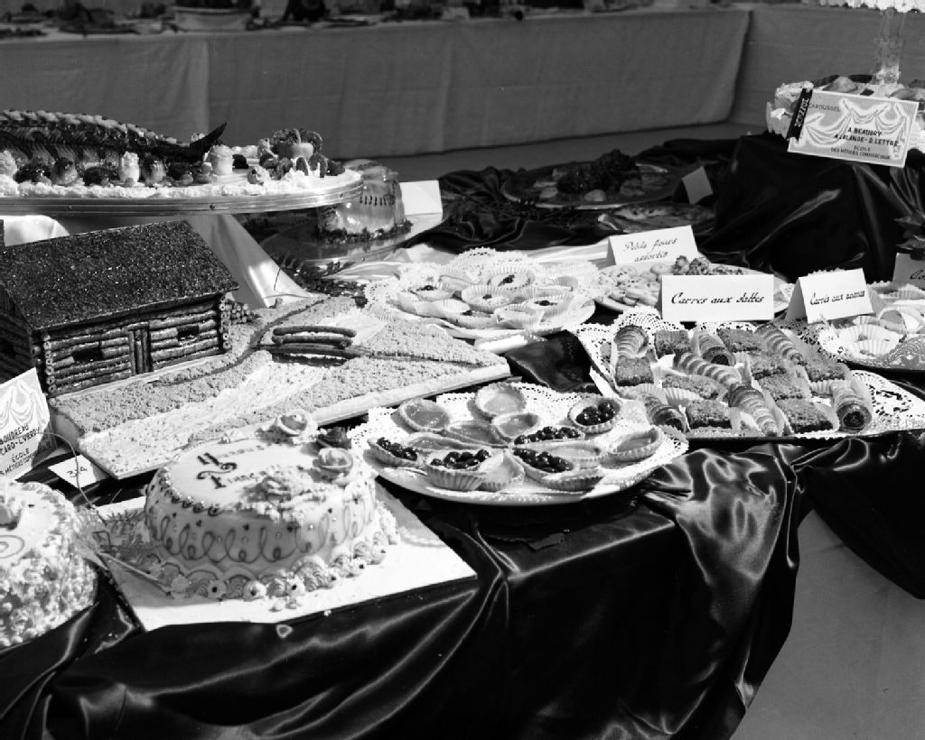Les oeuvres de Messieurs F.Bourdreau, Picard, L.Verdy, A.Beaudry, A.Lalande et D.Lettre, de l'École des métiers commerciaux, au Salon de l'art culinaire, organisé par le ministère du Commerce et de l'Industrie du Québec, au Palais du commerce à Montréal