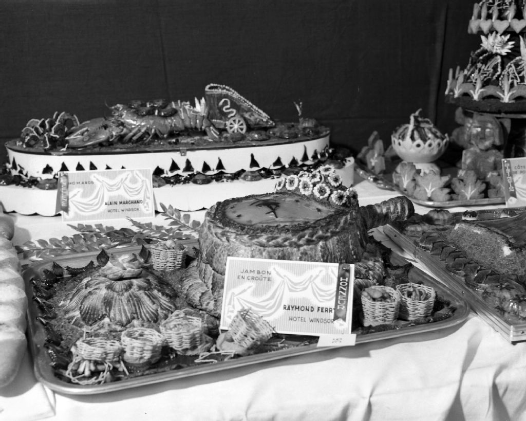 Les oeuvres de M.Raymond Ferry et d'Alain Marchand, de l'"Hôtel Windsor", au Salon de l'art culinaire organisé par le ministère du Commerce et de l'Industrie du Québec, au Palais du commerce à Montréal, 1959, Archives nationales à Montréal, Fonds Armour Landry, (06M,P97,S1,D14540-14540), Armour Landry.