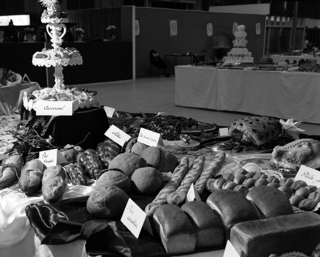 Le comptoir de la boulangerie, au Salon de l'art culinaire organisé par le ministère du Commerce et de l'Industrie du Québec, au Palais du commerce à Montréal, 1959, Archives nationales à Montréal, Fonds Armour Landry, (06M,P97,S1,D14545-14545), Armour Landry.