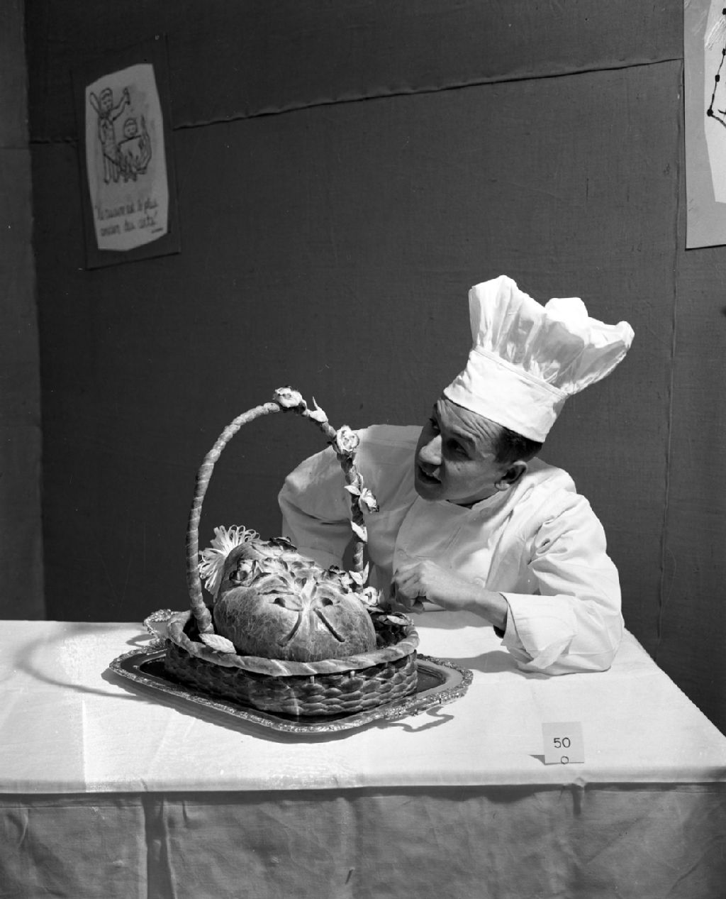 Cuisiniers à l'oeuvre au Salon de l'art culinaire, organisé par le ministère du Commerce et de l'Industrie du Québec, au Palais du commerce à Montréal, 1959, Archives nationales à Montréal, Fonds Armour Landry, (06M,P97,S1,D14567-14568), Armour Landry.