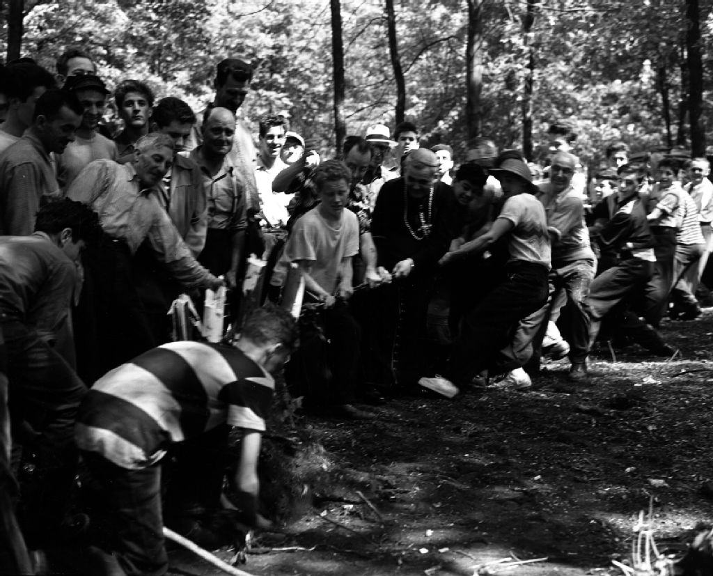 Participation du cardinal Paul-Émile Léger à l'extraction d'une souche avec des personnes du foyer de charité de Pointe-aux-Trembles (3478, 32e Avenue), Vers 1953, Archives nationales à Montréal, Fonds Armour Landry, (06M,P97,S1,D14603-14604), Armour Landry.