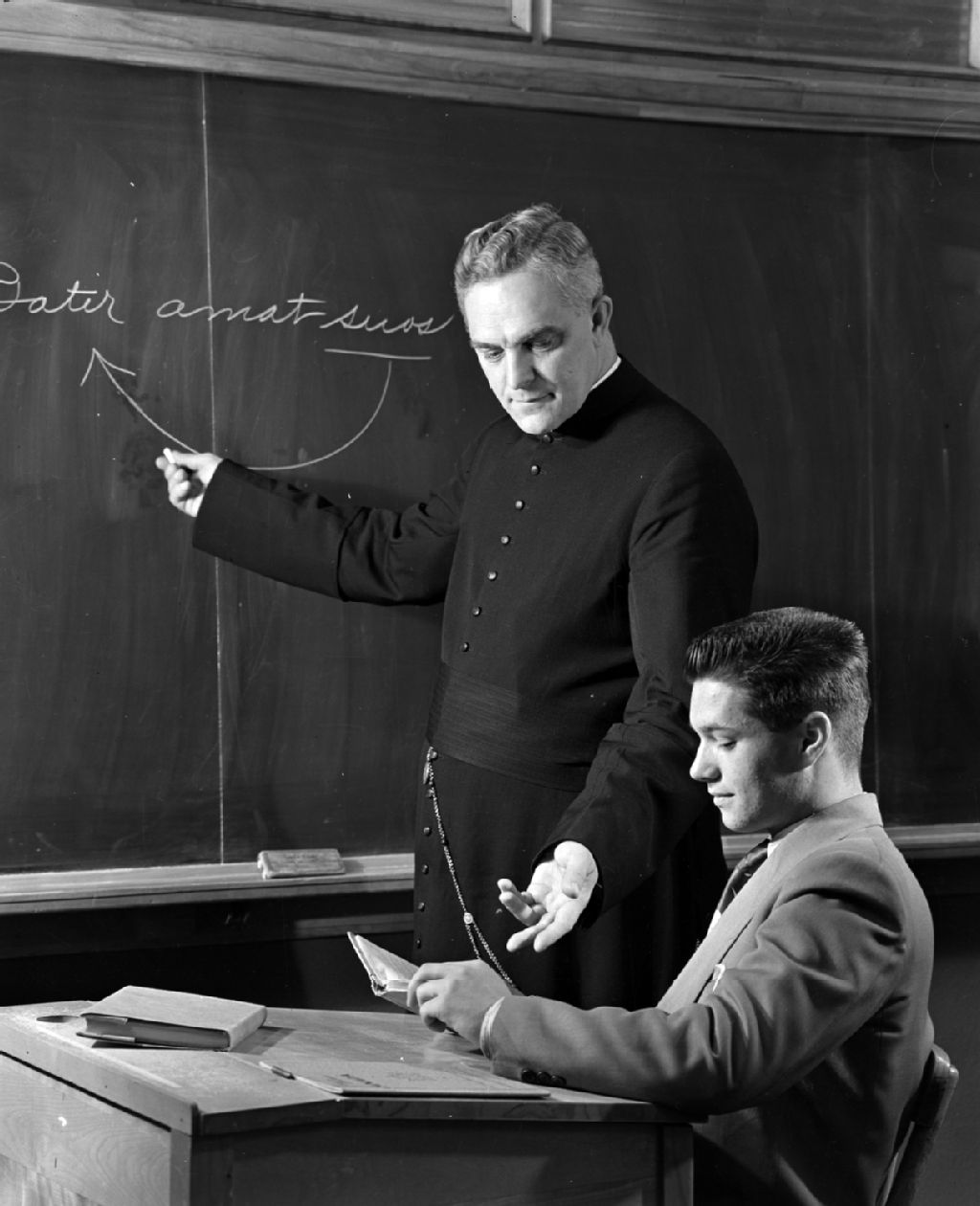 - Nous voyons plusieurs prêtres-enseignants avec des jeunes hommes dans des classes