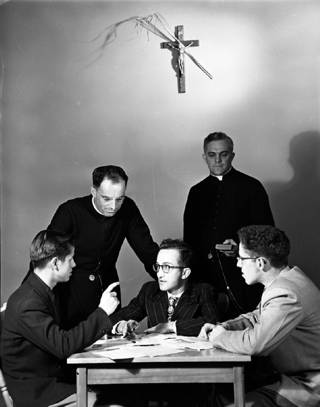 Une discussion de groupe entre religieux et étudiants de la congrégation religieuse des Clercs de Saint-Viateur