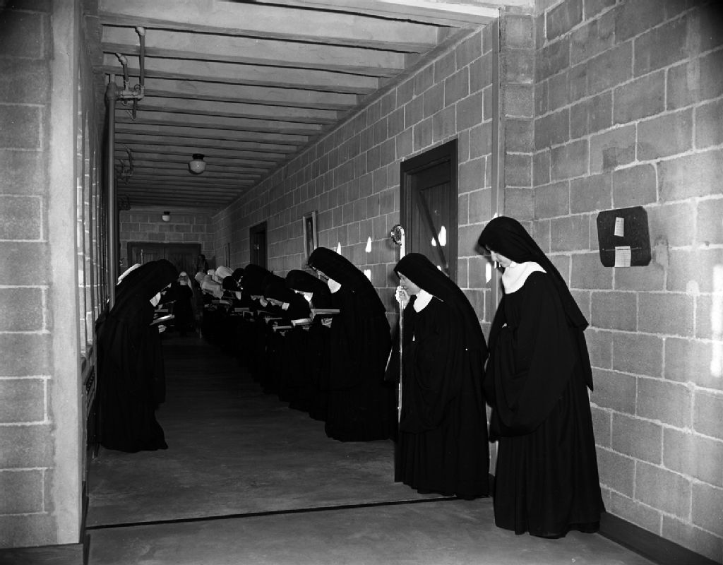 La prière des moniales bénédictines du monastère de Sainte-Marie des Deux-Montagnes à Saint-Eustache, Vers 1953, Archives nationales à Montréal, Fonds Armour Landry, (06M,P97,S1,D14739-14740), Armour Landry.