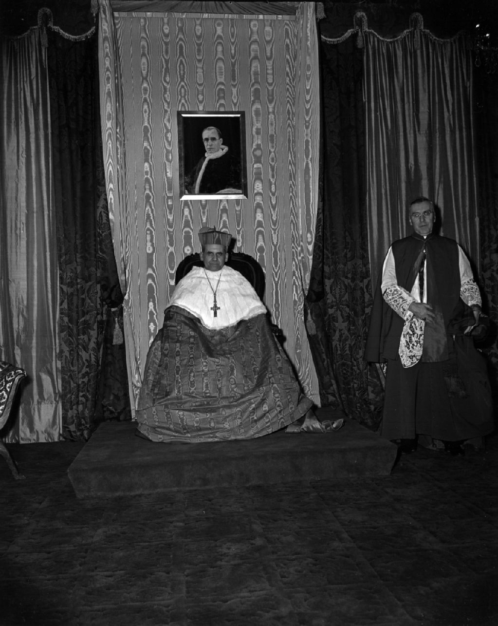Le cardinal Paul-Émile Léger dans le cathèdre de la cathédrale Marie-Reine-du-Monde, située sur le boulevard Dorchester (devenu boulevard René Lévesque) à Montréal, Vers 1950, Archives nationales à Montréal, Fonds Armour Landry, (06M,P97,S1,D14869-14870), Armour Landry.