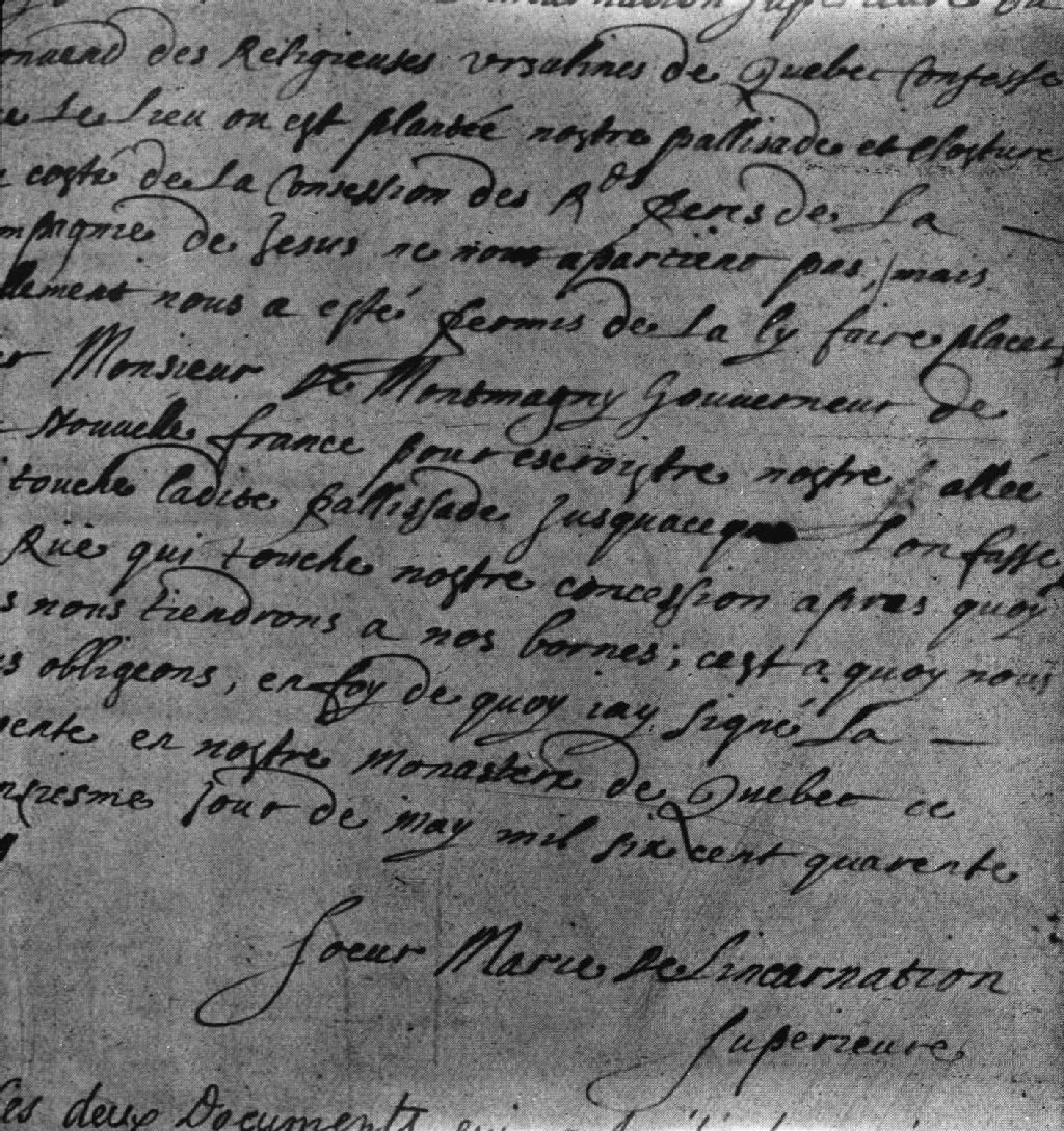 Copie d'un document portant la signature de Mère Marie-de-l'Incarnation pour le comité des fondateurs de l'Église de Montréal