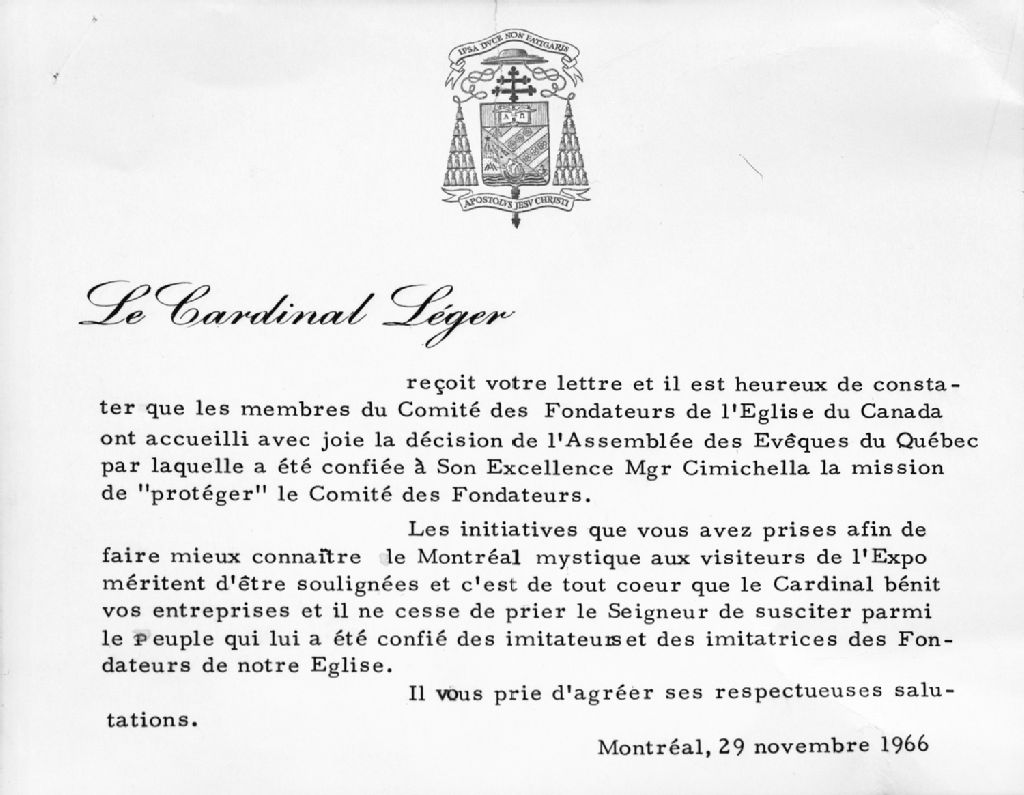 - Nous pouvons voir la lettre du cardinal Paul-Émile Léger au comité fondateur de l'Église du Canada, la lettre de l'archevêque du Québec (Maurice Roy ?) au Révérend Père Émile Gervais et le brouillon d'une présentation sur le patrimoine religieux