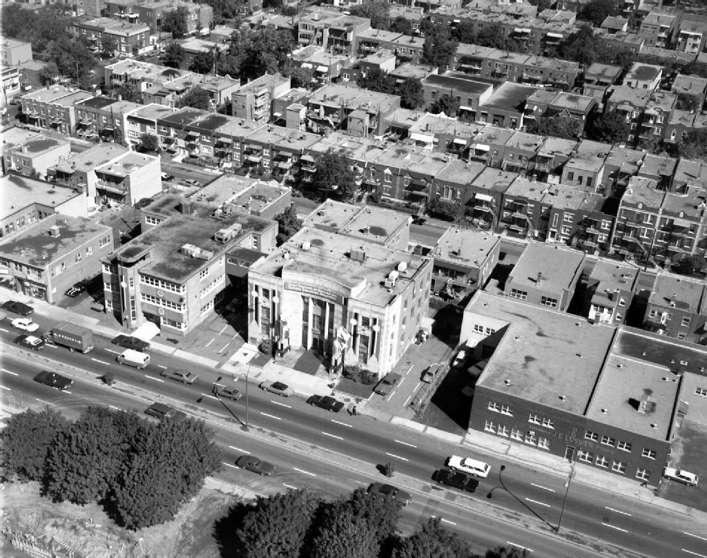 Il s¿agit d¿une vue aérienne du quartier dans lequel s'inscrit le bâtiment de la Caisse populaire Desjardins, à côté de la ferronnerie J. E. Lussier située sur le boulevard Saint-Laurent à Montréal