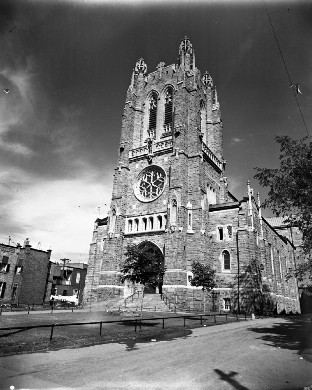 La façade de l'église Saint-Alphonse-d'Youville sur le boulevard Crémazie Est à Montréal, [Vers 1955], Archives nationales à Montréal, Fonds Armour Landry, (06M,P97,S1,D15417-15419), Armour Landry.