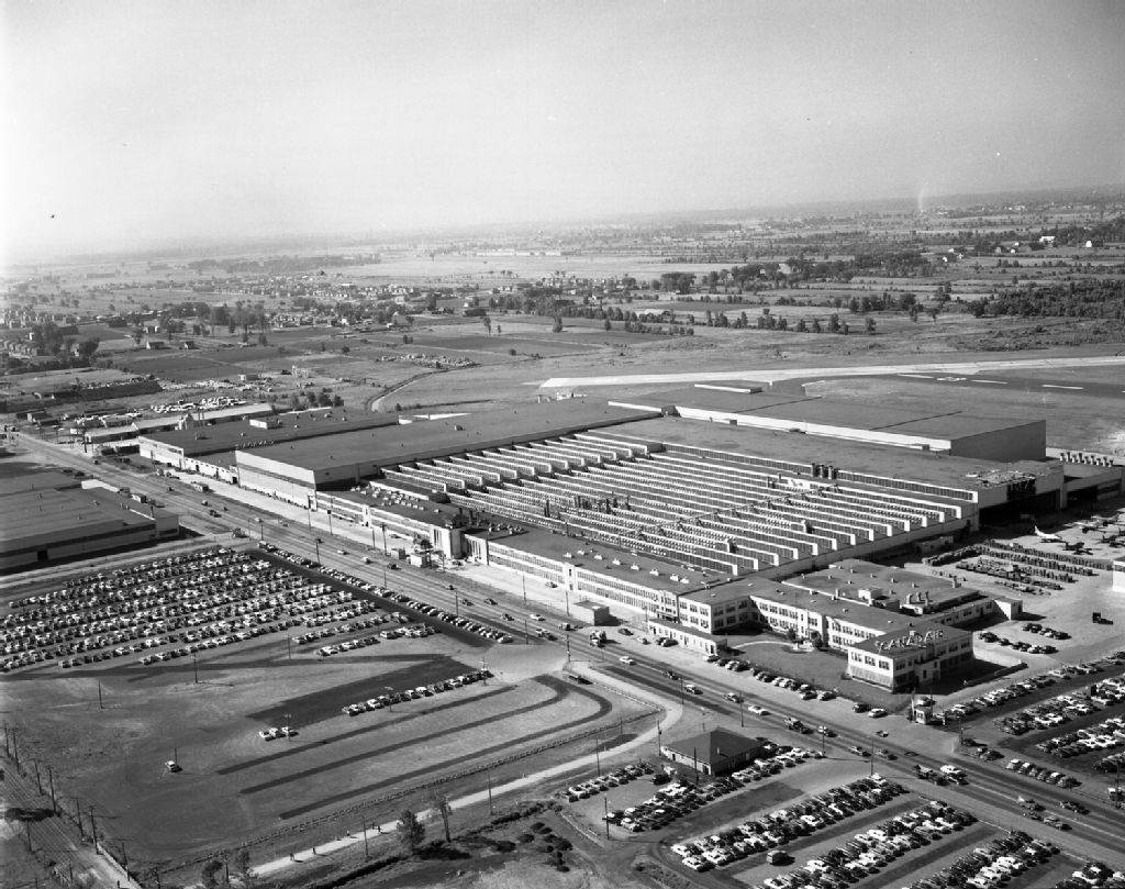 Vue aérienne sur l'usine Canadair situé sur l'aéroport de Cartierville, Ville Saint-Laurent, île de Montréal