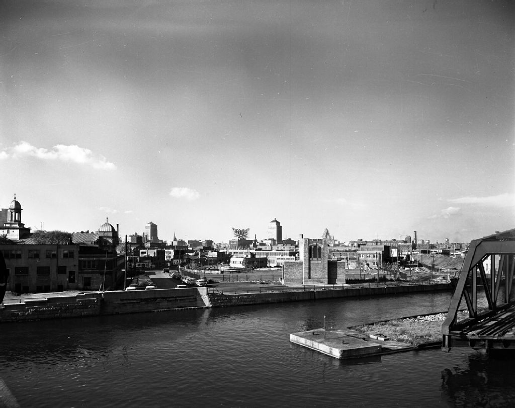 Vue aérienne sur le canal de Lachine et sur la rue Dock à Montréal, [Vers 1955], Archives nationales à Montréal, Fonds Armour Landry, (06M,P97,S1,D15505-15505), Armour Landry.