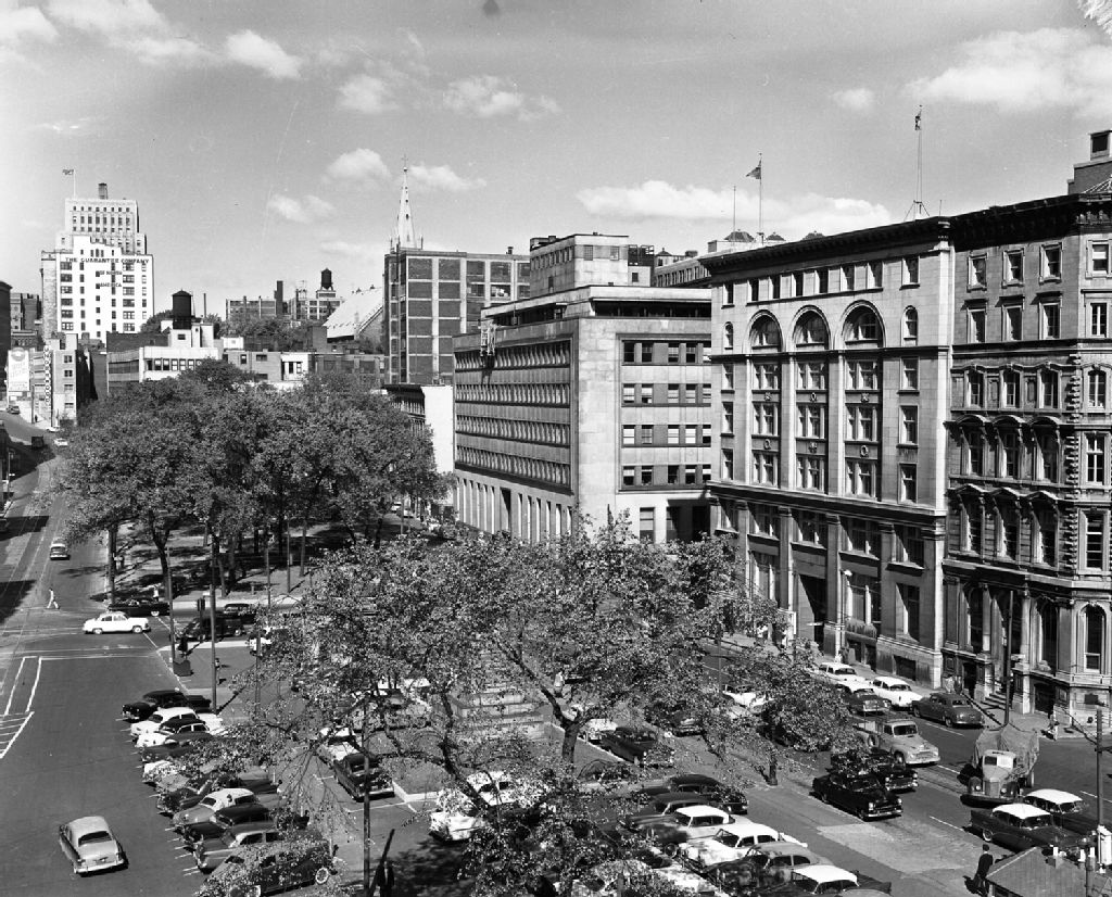 La place Victoria au croisement des rues Craig devenu rue Saint-Antoine et côte du Beaver-Hall à Montréal, 1954, Archives nationales à Montréal, Fonds Armour Landry, (06M,P97,S1,D15574-15574), Armour Landry.