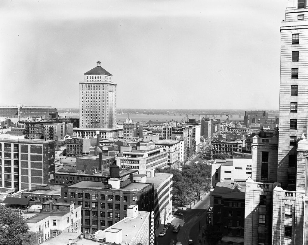 Nous remarquons les édifices de la Banque Royale et de la banque de la Nouvelle-Écosse, rue Saint-Jacques et l'Office Equipement Co of Canada Limited, côte du Beaver-Hall