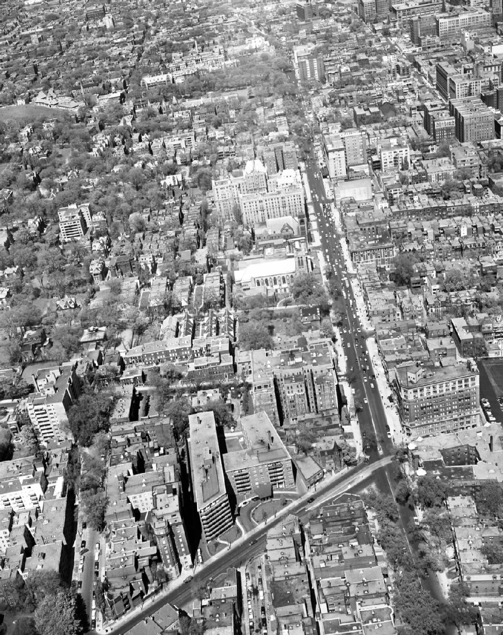 Vue aérienne sur la rue Sherbrooke Ouest à partir du chemin de la Côte-de-Neiges à Montréal, 1956, Archives nationales à Montréal, Fonds Armour Landry, (06M,P97,S1,D15587-15587), Armour Landry.