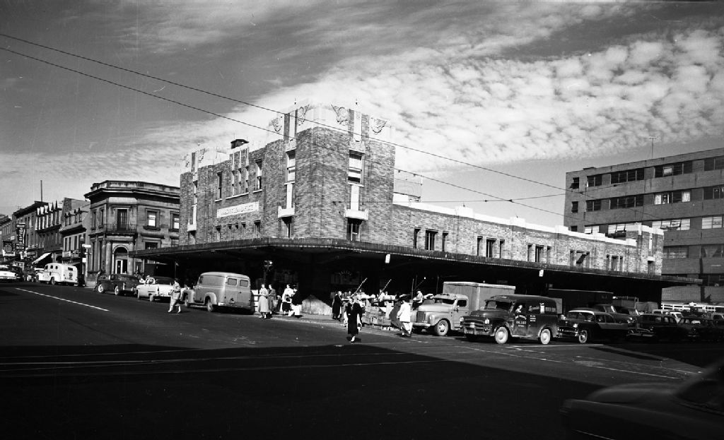 Le marché Saint-Jean-Baptiste compris entre les rues Saint-Laurent, Rachel, Lozeau et Saint-Dominique, à l'emplacement actuel du parc des Amériques à Montréal, 1951, Archives nationales à Montréal, Fonds Armour Landry, (06M,P97,S1,D15597-15597), Armour Landry.