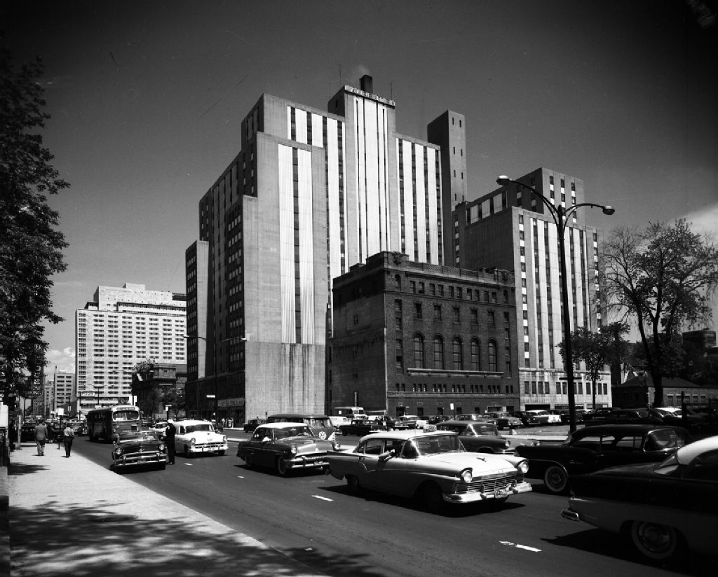 L'hôtel le Laurentien à l'angle du boulevard Dorschester et de la rue Stanley à Montréal, 1957, Archives nationales à Montréal, Fonds Armour Landry, (06M,P97,S1,D15615-15616), Armour Landry.