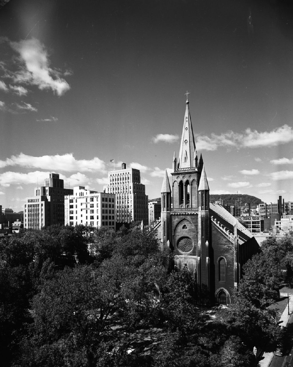 L'église Saint-Patrick à l'angle des rues de la Gauchetière Ouest et de la rue Saint-Alexandre à Montréal, 1956, Archives nationales à Montréal, Fonds Armour Landry, (06M,P97,S1,D15617-15617), Armour Landry.