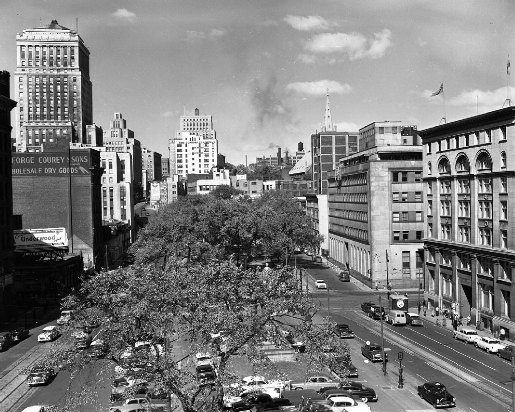 La place Victoria au croisement des rues Craig, devenu rue Saint-Antoine, et côte du Beaver-Hall à Montréal, 1949, Archives nationales à Montréal, Fonds Armour Landry, (06M,P97,S1,D15622-15622), Armour Landry.