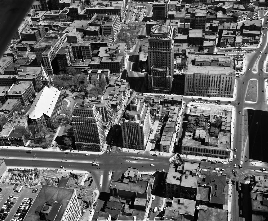Vue aérienne sur le quartier situé à l'angle du boulevard René-Lévesque, de la rue University et de la côte du Beaver-Hall à Montréal, 1949, Archives nationales à Montréal, Fonds Armour Landry, (06M,P97,S1,D15676-15676), Armour Landry.