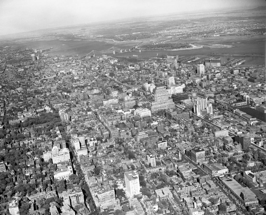 Vues aériennes sur le centre-ville, le Vieux-Montréal et le port de Montréal, 1949, Archives nationales à Montréal, Fonds Armour Landry, (06M,P97,S1,D15677-15678), Armour Landry.