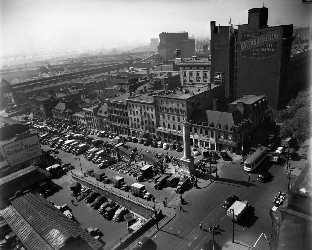 La place Jacques-Cartier vu de la lunette de l'Hôtel de ville, rue Notre-Dame dans le Vieux-Montréal, 1948, Archives nationales à Montréal, Fonds Armour Landry, (06M,P97,S1,D15700-15700), Armour Landry.