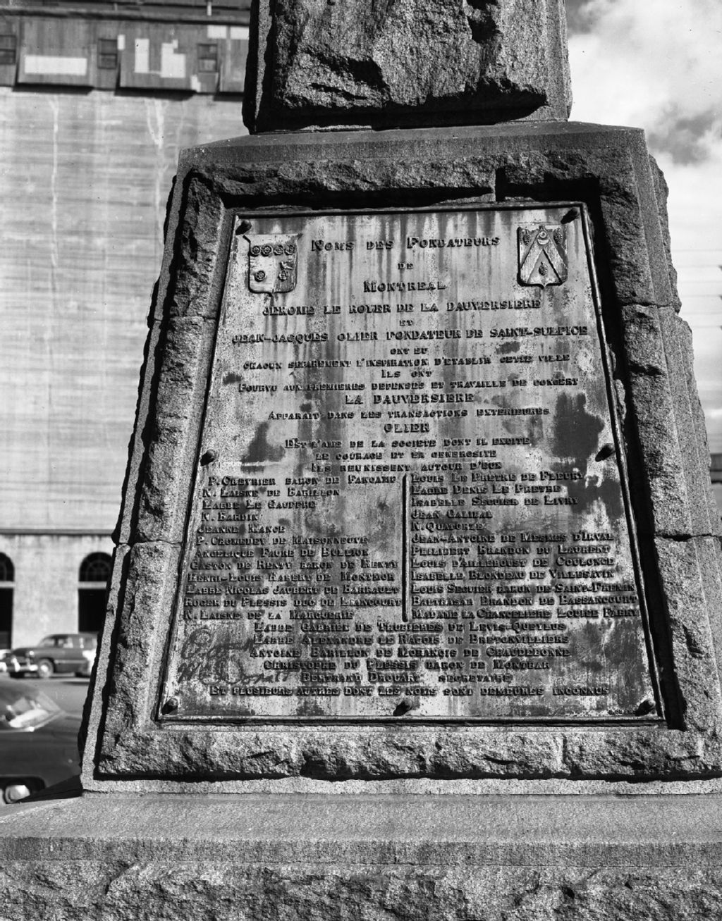 Plaque commémorative des fondateurs de Montréal sur le Monument aux pionniers, place Royale dans le Vieux-Montréal