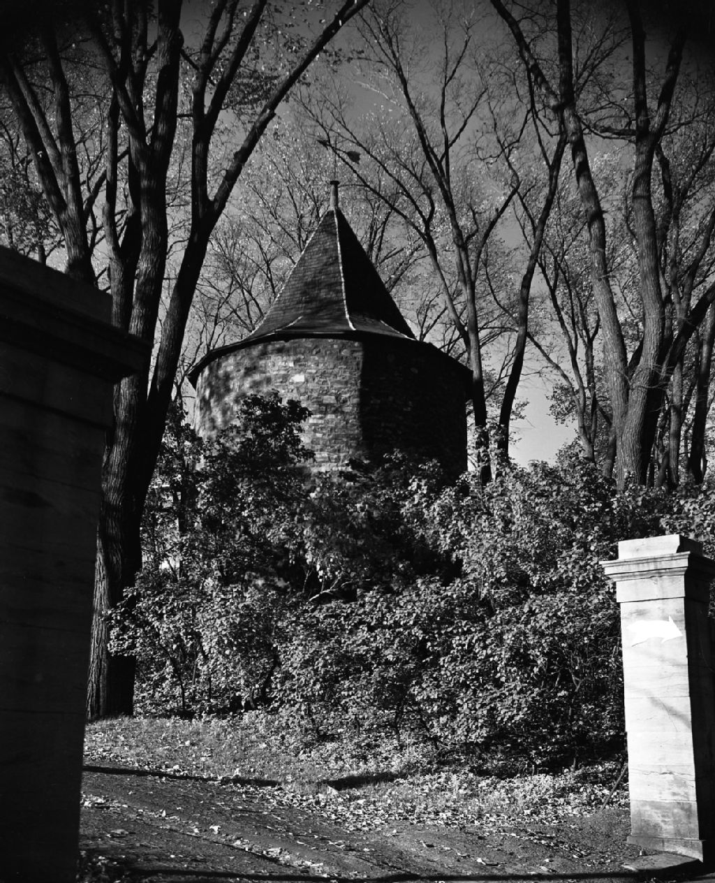 La Tour du fort des Sulpiciens dans le jardin du grand Séminaire, aujourd'hui Collège de Montréal, situé rue Sherbrooke Ouest à Montréal, 1949, Archives nationales à Montréal, Fonds Armour Landry, (06M,P97,S1,D15736-15738), Armour Landry.