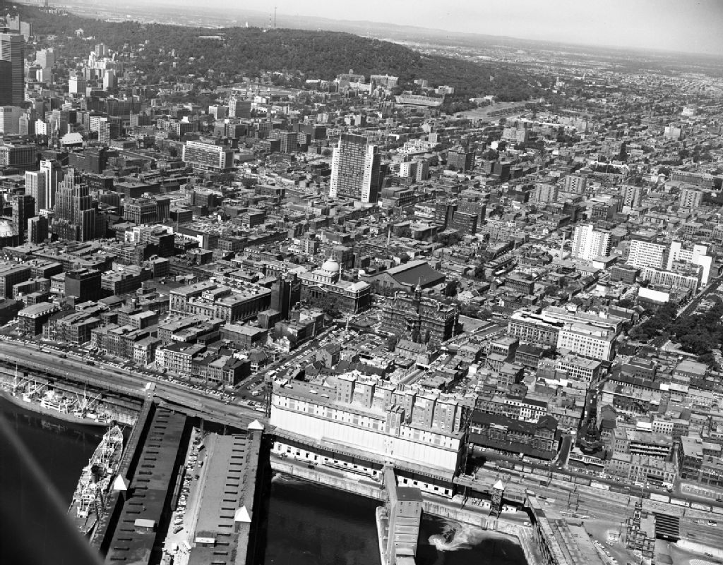 Vue aérienne sur la place Jacques-Cartier dans le Vieux-Montréal, 1962, Archives nationales à Montréal, Fonds Armour Landry, (06M,P97,S1,D15758-15758), Armour Landry.