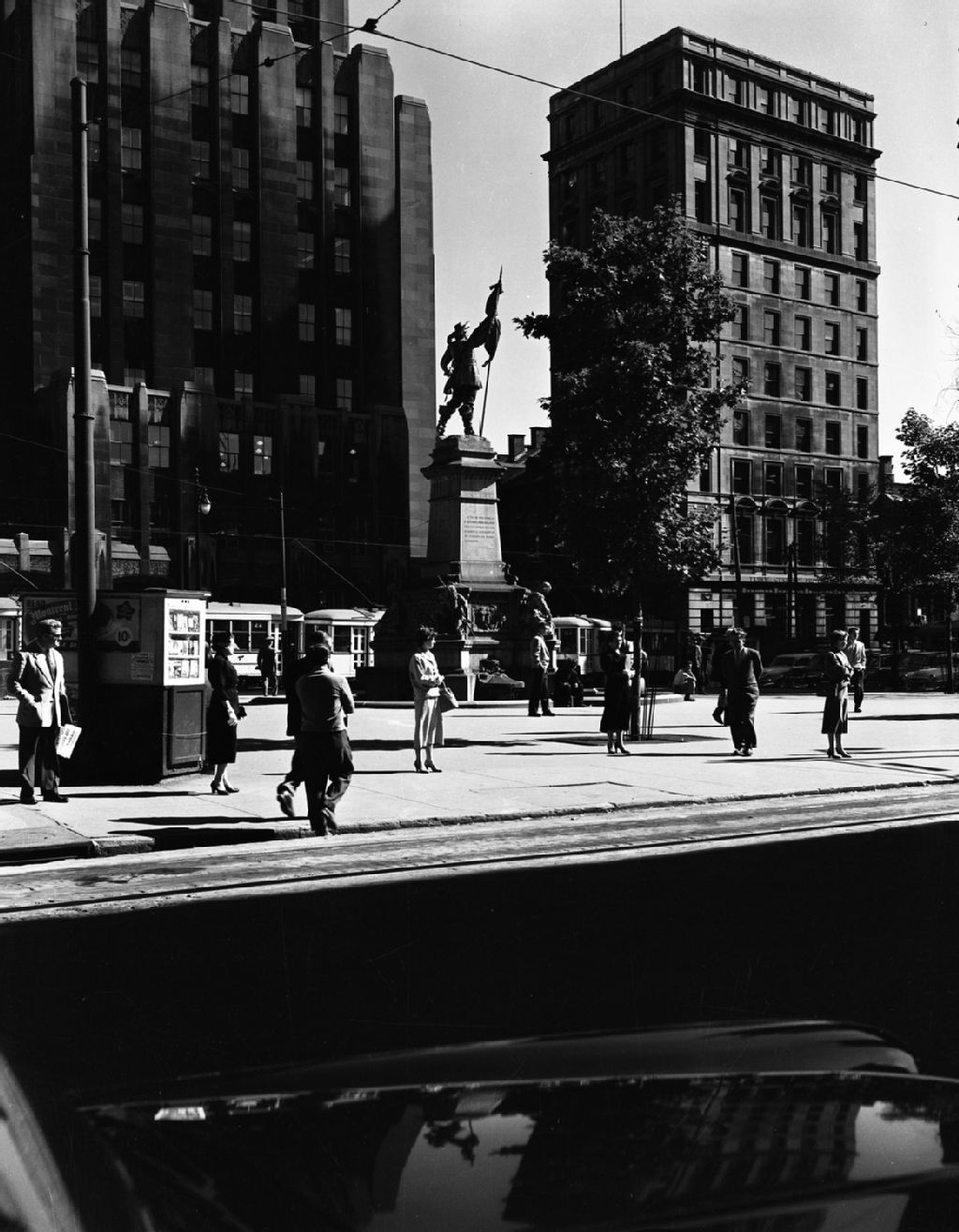 Le monument à Paul de Chomedey, sieur de Maisonneuve sur la place d'Armes dans le Vieux-Montréal, 1954, Archives nationales à Montréal, Fonds Armour Landry, (06M,P97,S1,D15767-15767), Armour Landry.