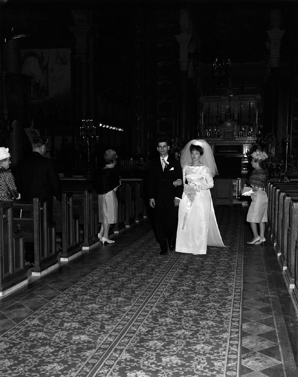 - Le couple est photographié à l'intérieur de la maison familiale, devant la table des cadeaux, lors de la cérémonie religieuse à l'église Saint-Vincent-Ferrier rue Jarry Est à Montréal et lors de la réception