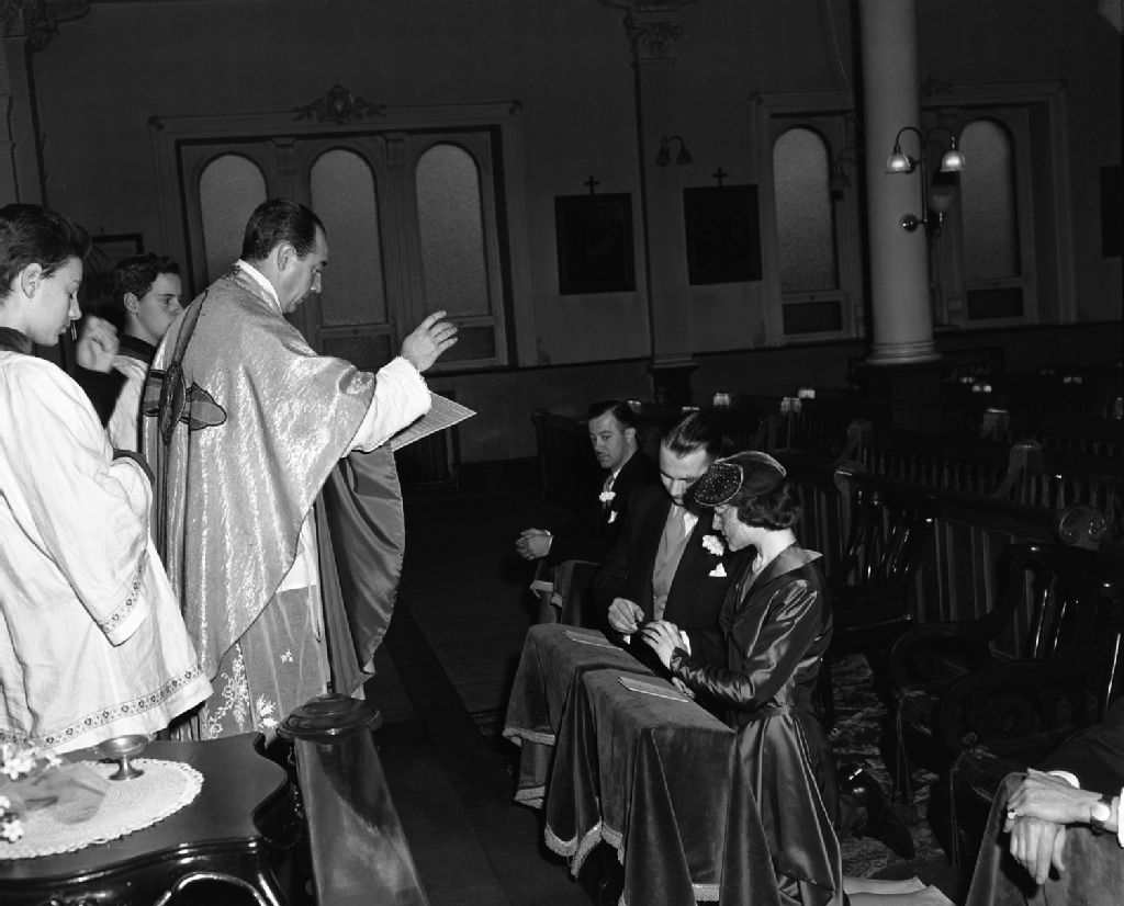 - Le couple est photographié à l'intérieur de la maison familiale, devant la table des cadeaux, lors de la cérémonie religieuse à l'église et lors de la réception