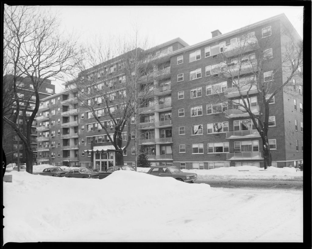 Immeuble d'habitations Le Manoir Westmount situé au 250, avenue Kensington, Westmount, île de Montréal, 20 décembre 1972, Archives nationales à Montréal, Fonds Armour Landry, (06M,P97,S1,D18280-18280), Armour Landry.