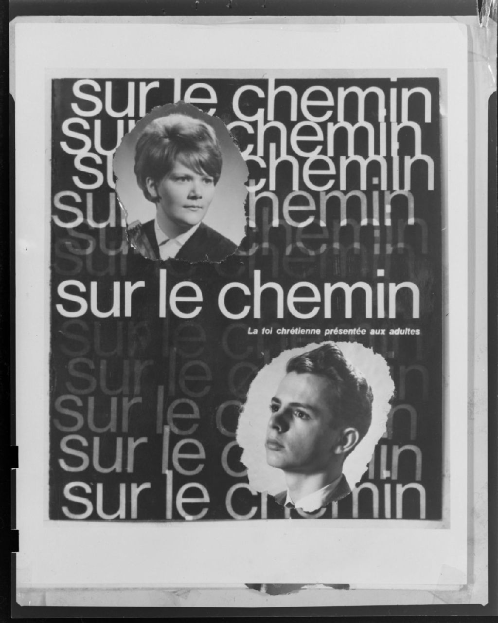 Reproduction d'une affiche "Sur le chemin..." composée pour l'abbé Hardy, têtes de gradués pour le semainier de juin