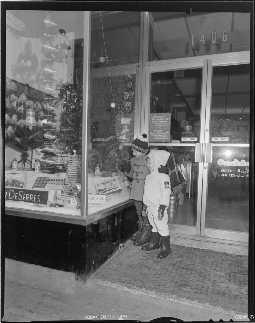 Les enfants de M. Jean Renaud devant un magasin de loisirs créatifs Omer de Serres au moment de Noël, 24 décembre 1967, Archives nationales à Montréal, Fonds Armour Landry, (06M,P97,S1,D19250-19251), Armour Landry.