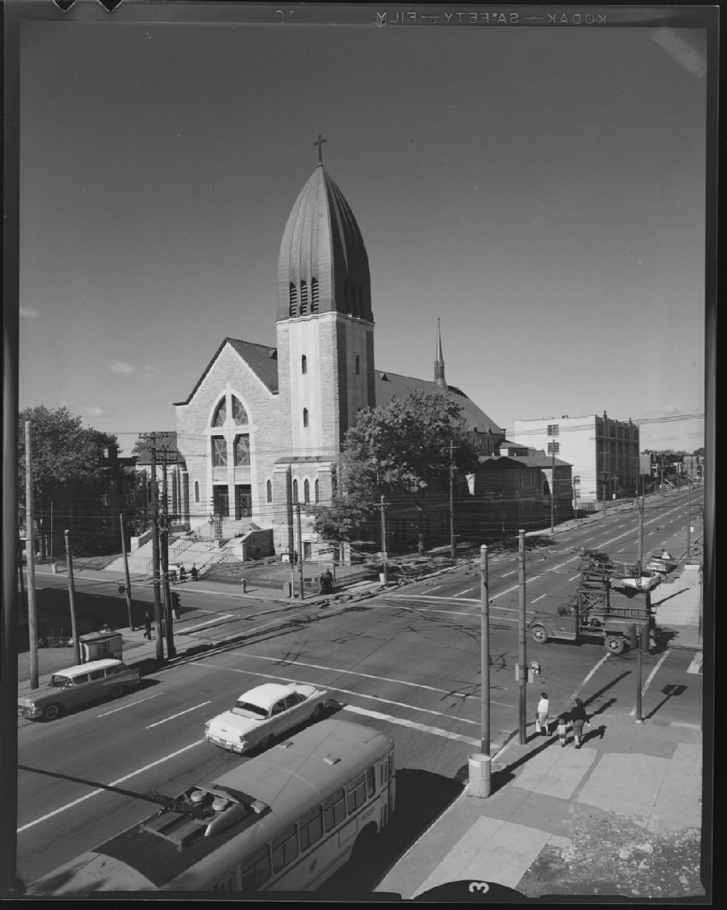 L'église Saint-Eusèbe, aujourd'hui appelée église Saint-Arsène, située à l'angle de l'avenue Christophe-Colomb et de la rue Bélanger à Montréal, [Vers 1960], Archives nationales à Montréal, Fonds Armour Landry, (06M,P97,S1,D19266-19266), Armour Landry.
