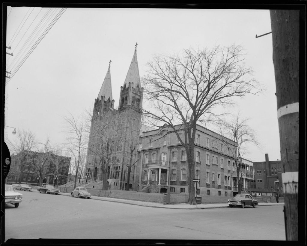 L'église Très-Saint-Nom-de-Jésus située à l'intersection de l'avenue Desjardins et de la rue Adam à Montréal, [Vers 1960], Archives nationales à Montréal, Fonds Armour Landry, (06M,P97,S1,D19297-19297), Armour Landry.