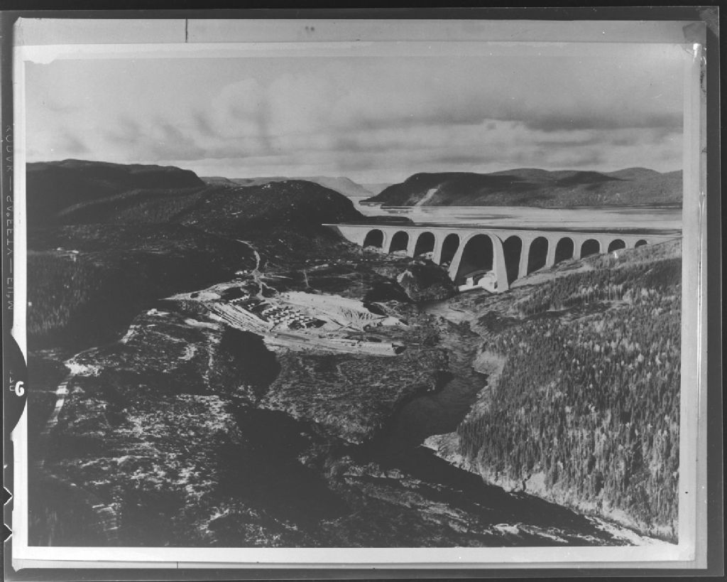 Reproduction ou montage d'une photographie illustrant le barrage Daniel-Johnson situé dans la vallée de la rivière Manicouagan, Côte-Nord, [Vers 1960], Archives nationales à Montréal, Fonds Armour Landry, (06M,P97,S1,D19442-19443), Armour Landry.