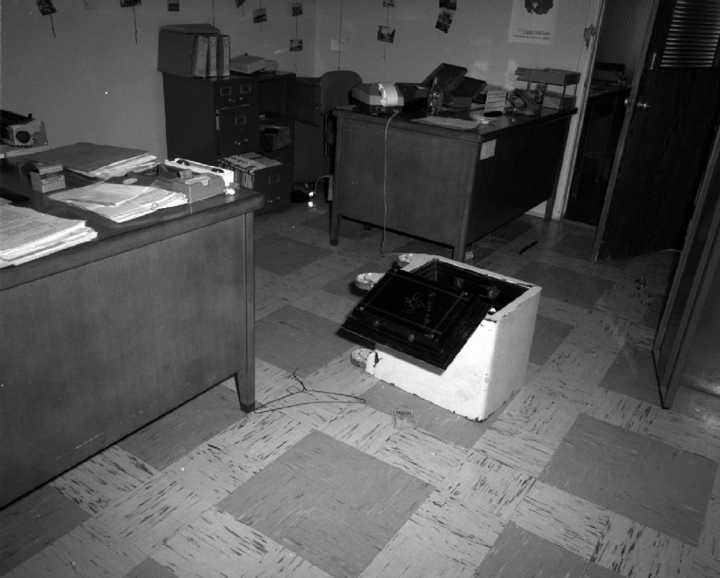 Le bureau du professeur Lapierre vandalisé, au Conservatoire national de musique, rue Saint-Denis à Montréal, Juin 1970, Archives nationales à Montréal, Fonds Armour Landry, (06M,P97,S1,D1945-1948), Armour Landry.
