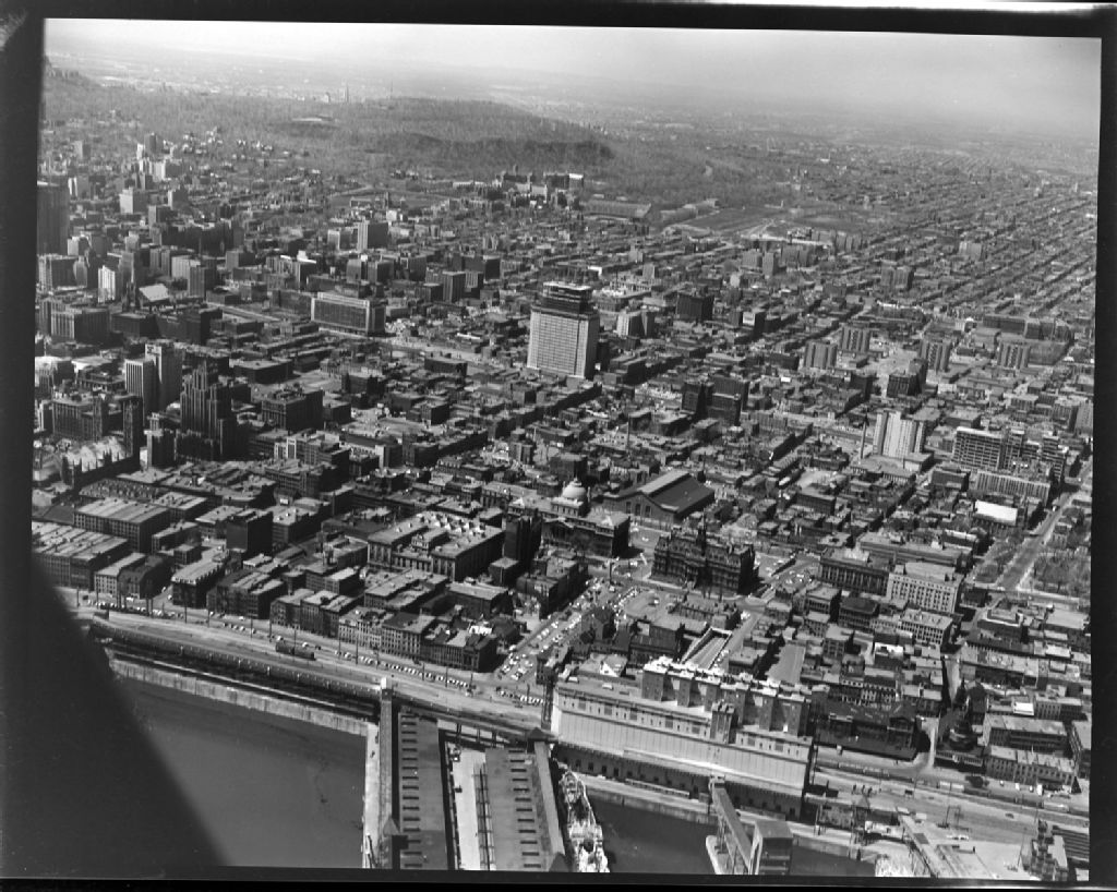 Vues aériennes sur l'immeuble Dorchester, siège d'Hydro-Québec sur le boulevard Dorchester devenu boulevard René-Levesques à Montréal, 6 mai 1961, Archives nationales à Montréal, Fonds Armour Landry, (06M,P97,S1,D19469-19470), Armour Landry.