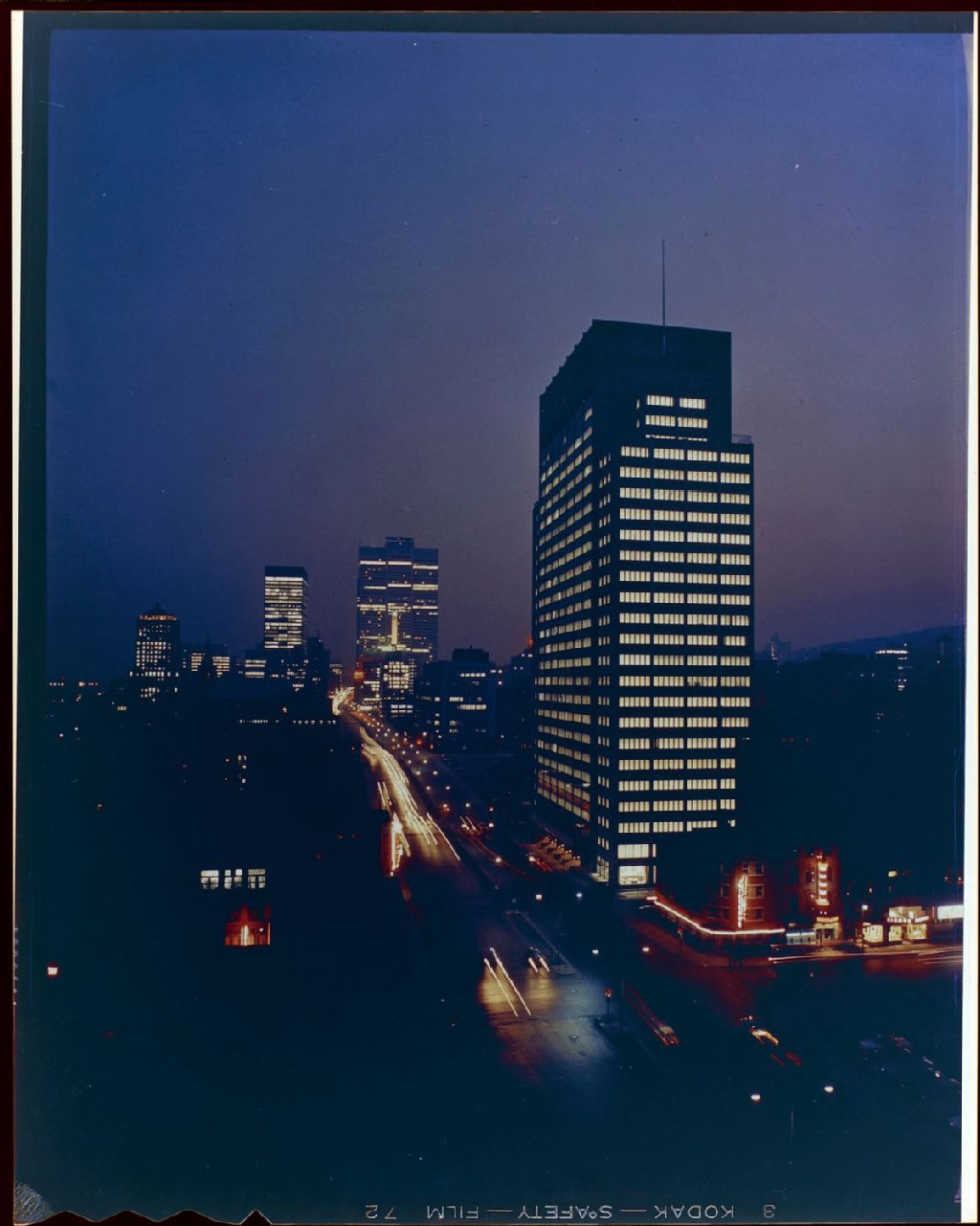 L'immeuble Hydro-Québec la nuit, boulevard Dorchester devenu René-Lévesque à Montréal